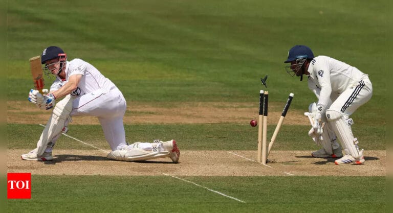 Akash Deep knocked over Harry Brook’s middle stump. (Pic credit: BCCI) Harry Brook’s aggressive brand of cricket came crashing down …
