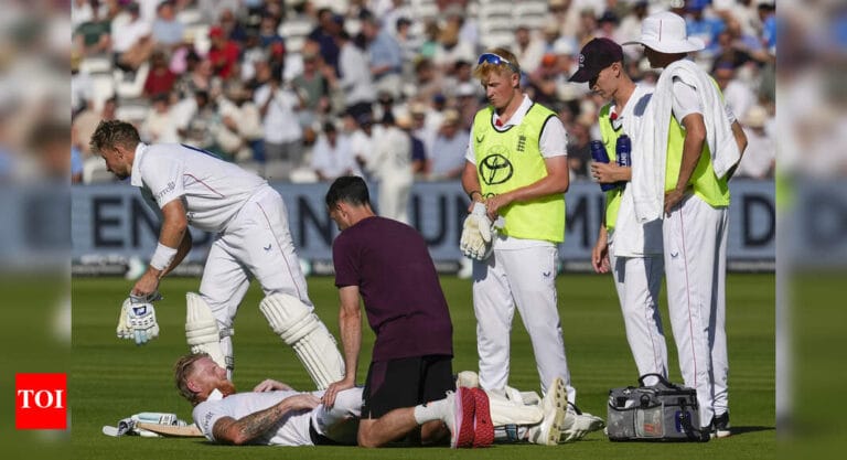 England’s captain Ben Stokes being assisted by a physio due to muscle cramp at the Lord’s Cricket Ground. (PTI Photo) …