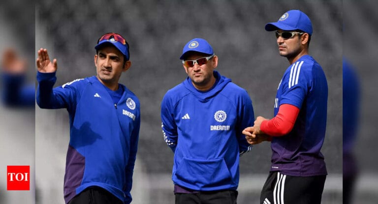 India captain Shubman Gill speaks with coach Gautam Gambhir and selector Ajit Agarkar during a net session at Emirates Old …